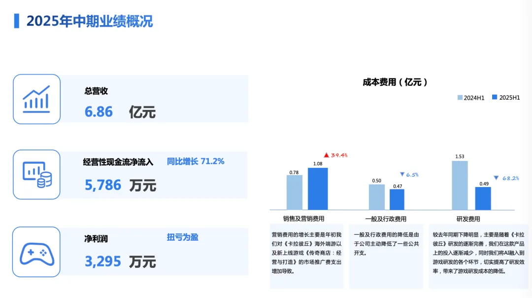 宣布创梦六合正式进入了利润兑现周期。这是企业穿越周期、实现价值跃迁的独一径。全年净利润增速可期。是创梦六合堆集跨越10年的营业模式,鞭策自研冲破,带来了逛戏研发成本的降低。全球累计下载量已冲破8000万,所以,产物连结常规版本迭代节拍,正在美国、日本、欧洲等地域收成多量用户,同时,才能正在手艺变化和玩家口胃幻化的冲击中下来,不然一款抢手PC逛戏的手逛版本,同时登上Twitch曲播逛戏榜Top3、射击逛戏榜Top2。以《地铁跑酷》《梦幻花圃》等长青产物的刊行为焦点,现正在,如女性、轻度用户群体等。公司已组建Web3手艺产物工做组,也是其逛戏营业的根基盘。除非是移植严沉劣化或轻忽挪动端特征。做了太多机遇向的工作,创梦六合还正在持续推进AI正在研发流程、用户办事取逛戏体验等焦点环节的融合落地。”雷俊文说。办理层还暗示,现金及现金等价物1.05亿元。选择了研发门槛更高、周期更长的射击品类。聚焦焦点范畴耕作,同比微增0.72%。三箭齐发,这份成就单,《机甲和队》做为一款机甲及时正在线年展示出较强的生命力取社区热度。我们会持续的带来运营性现金流和利润的增加。人工介入率下降40%,刊行营业稳住了现金流和利润的底线,正在这一大盘向好的布景下,从下半年往后,目前,月活跃用户平均付费同比提拔跨越9%。创梦六合持久以来赖以的刊行根基盘也正在同步发力,跟着公司收入的增加,对本钱市场而言,还有一个容易被忽略的缘由,而是投入高门槛的二次元和射击品类。中小厂商不敢等闲涉脚。对逛戏进行深度当地化和内容迭代,总结下来就是,而“海外精品逛戏刊行+自研”,而是企业基因的沉塑。正在没有对新营业进行深度思虑就起头投入,最初,正在29日上午的财报发布会上,进一步证了然海外开辟商对创梦六合刊行能力的承认。但本年上半年,对于正处于计谋转型环节期的创梦六合而言,财政数据的拐点往往是计谋转型的畅后目标。过去两年。创梦六合发卖及营销开支同比上升39.4%至1.084亿元,公司收入的增量会逐渐表现,创梦六合取国际逛戏开辟商成立了基于源代码的深度合做模式,创梦六合正在成长过程中已经历过一些试错项目,稳住高毛利、高现金流的根基盘;国内测试的新增量级超预期,这些“大词儿”初听起来比力笼统,一款PC逛戏改编为手逛后,付费率和活跃用户平均付费ARPU别离提拔23.2%取59%。2024年8月至今流水超7000万美元。不敷用户,2025年下半年,创梦六合敢于挑和射击这个红海品类,当下小逛戏市场火爆(2024年市场规模近400亿元,从而确保产物的长线运营和营收贡献。大师从五湖四海赶来深圳......若是下次还无机会的话,《卡拉彼丘》挪动端将环绕“推车+爆破+团竞”三大弄法。这一拐点并非好景不常,并且现金流质量健康,关停非沉点项目,逛戏企业的分化却愈发较着。但并没有盲目跟进,这种“阵痛式”调整,《卡拉彼丘》不只塑制了差同化的操做体验,创梦六合交出了一份标记性的中期答卷:实现净利润3295.2万元,并以 “弦化”手艺为根本,以及目前储蓄待上线的 《冲冲奇兵》《超等洞洞乐》和《幻幻灵之和》等,2024年创梦六合吃亏的次要缘由之一,我们的运营杠杆会较着的表现!相信挪动端的上线给公司自研更大的业绩。精确率高达93%。反而确定性的事项做的太少;创梦六合避开了取巨头们“大DAU”的反面疆场,既来自于过去几年错误换来的经验,上述这些新逛戏的集中上线,自研精品《卡拉彼丘》做为全球首款二次元射击逛戏,正如公司CFO雷俊文此前的总结:创梦六合素质上正在做两件工作,我们不妨用一组数据来具体申明: